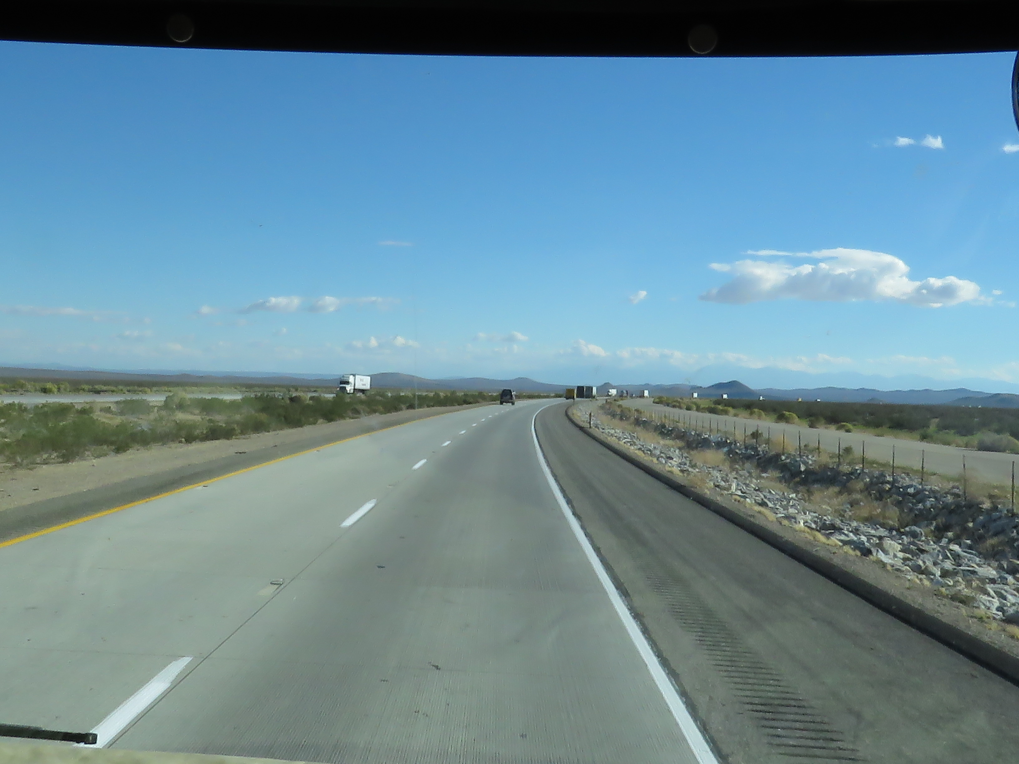 8 AM my alarm goes off. Well it really goes off at 7:30 AM but we stay under the warm covers snoozing for another half hour (What, do I hear a groan out there? We are retired after all). After a lazy morning getting ourselves, Pepper and the RV ready for the road I relax behind the wheel and leave Orange Grove RV Park, Bakersfield, California, turning onto CA State Route 58 East and make our way to Barstow. I love driving the RV (Can everyone tell Connie is the writer today?). The open road as seen through the beautiful panoramic view of the cab windshields. I have dreamed about this for years and here I Am. An Arizona Lizard living the Nomadic life.