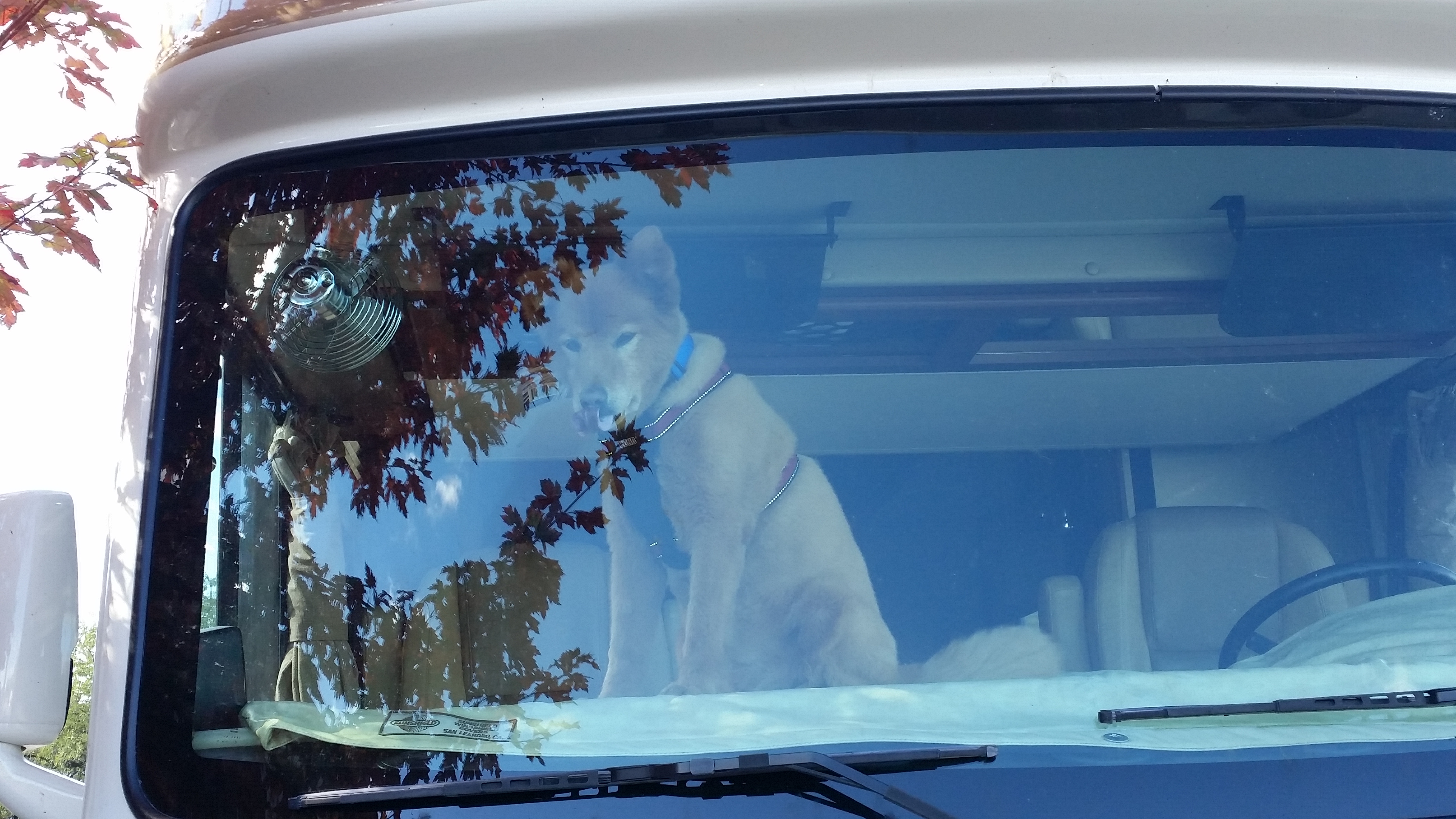 This was a nice little break from being on the road breaking down and setting up everyday. Pepper enjoyed her time sniffing around all the buildings and bushes catching up on e-mail messages left by other RV dogs. Her other favorite pastime is her version of TV. She lays on the dash board and watches people and dogs pass by. It seems to be a very common pastime for RV critters as I see many dogs and cats hanging out when we go for our walks.